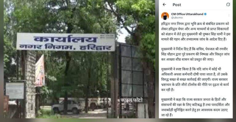 हरिद्वार। हालांकि सराय स्थित नगर निगम के भूमि घोटाले की जांच विजिलेंस में गतिमान है, किंतु जांच की आंच में जिलाधिकारी कर्मेंद्र सिंह के साथ-साथ एसडीम अजय वीर सिंह और पूर्व नगर आयुक्त इस वरुण चौधरी सहित आधा दर्जन से अधिक कर्मचारी और अधिकारी सस्पैंड भी किए जा चुके है,