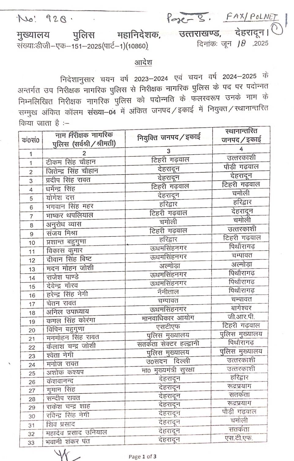 देहरादून!पुलिस महानिरीक्षक (कार्मिक) योगेंद्र रावत ने 82 पुलिस इंस्पेक्टर के अलग अलग जनपदों में तबादले कर दिए ,