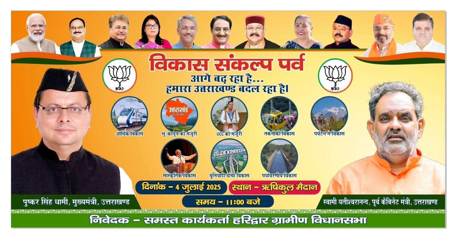 हमारा उत्तराखंड आगे बढ़ते हुए बदल रहा है के आह्वान पर विकास संकल्प पर्व का आयोजन किया जा रहा है। जिसमें भाजपा के विधायक, पदाधिकारियों एवं कार्यकर्ताओं ने कार्यक्रम में अधिक से अधिक से शामिल कराने के लिए सभी जीतोड़ मेहनत करते हुए जनसंपर्क कर रहे हैं। पूर्व कैबिनेट मंत्री स्वामी यतीश्वरानंद ने आमजन से अपील की है कि कार्यक्रम में शामिल होकर मुख्यमंत्री पुष्कर सिंह धामी का विजन और संचालित की जा रही जनकल्याणकारी योजनाओं के बारे में जानकारी मिल सकेगी। स्वामी यतीश्वरानंद ने कहा कि मुख्यमंत्री पुष्कर सिंह धामी आमजन से लेकर गरीबों को आगे बढ़ाने के लिए निरंतर कार्य कर रहे हैं। आज प्रदेश में हर वर्ग उनकी योजनाओं से खुश है। उन्होंने विधानसभा हरिद्वार ग्रामीण के साथ सभी निवासियों से आह्वान किया कि मुख्यमंत्री के विचारों को सुनने के लिए ऋषिकुल मैदान में अवश्य पहुंचे। भाजपा के जिलाध्यक्ष आशुतोष शर्मा ने सभी मंडल के पदाधिकारियों के साथ कार्यकर्ताओं के अपील की है कि वे सभी अपने क्षेत्र के महिला पुरुषों, युवाओं को लेकर कार्यक्रम में शामिल हो।