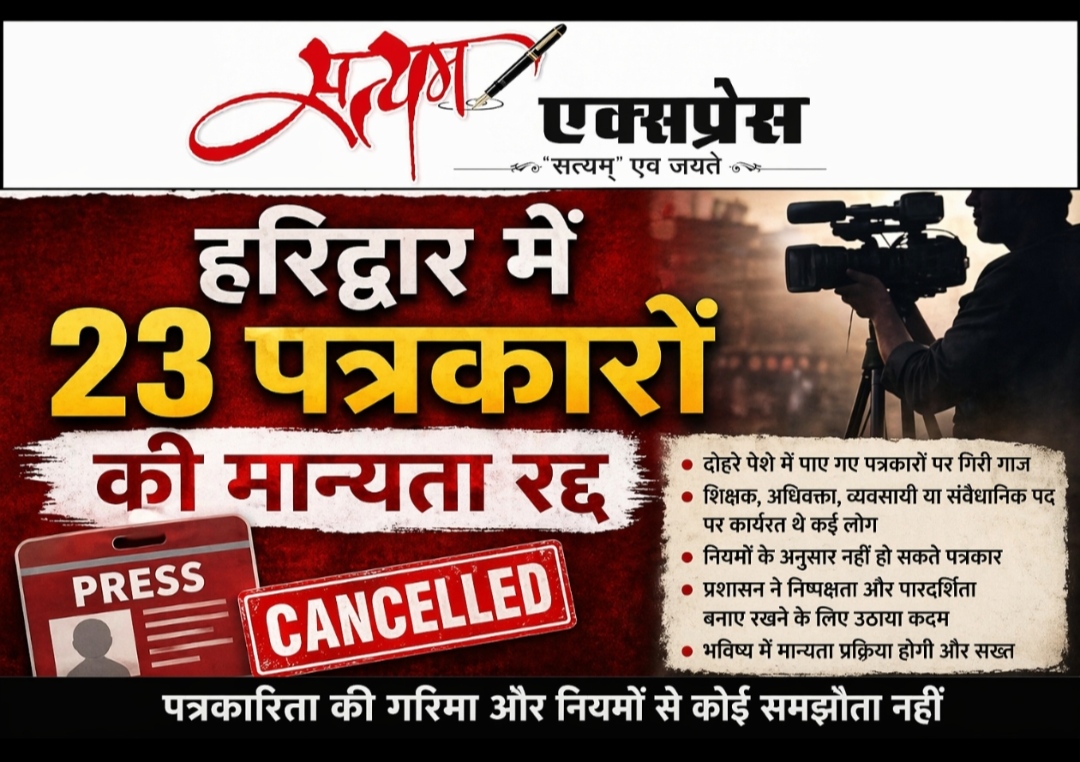 हरिद्वार। जिला प्रशासन ने बड़ी कार्रवाई करते हुए 23 पत्रकारों की शासकीय मान्यता रद्द कर दी है। बताया जा रहा है कि जिन लोगों की मान्यता समाप्त की गई है, वे पहले से ही अन्य पेशों जैसे शिक्षक, अधिवक्ता, व्यवसायी या किसी संवैधानिक पद से जुड़े हुए थे। नियमों के अनुसार ऐसे व्यक्ति सरकारी मान्यता प्राप्त पत्रकार की श्रेणी में नहीं आ सकते।